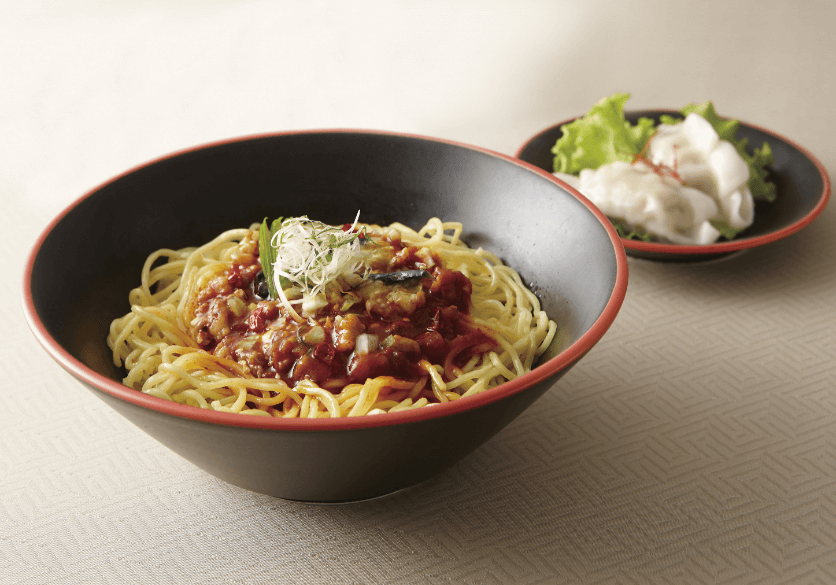 王道のつけ麺なら、具材が映える黒の丼ぶりにお椀を添えて。中華麺以外にも蕎麦、パスタや盛りつけ皿としても幅広くご使用いただけます。